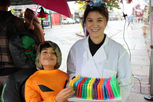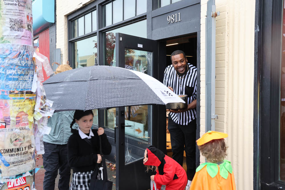 Just take an umbrella along with your trick-or-treat bag, and you’ll be fine! White Center’s trick-or-treat-and-more block party is defying the wet weather.