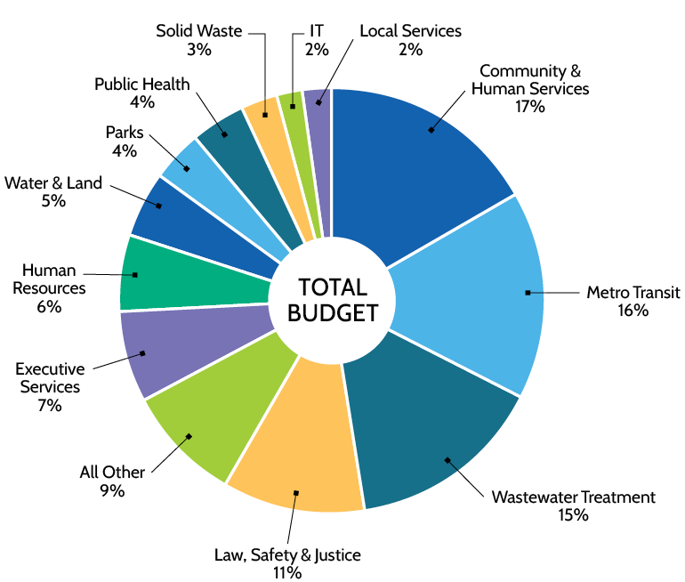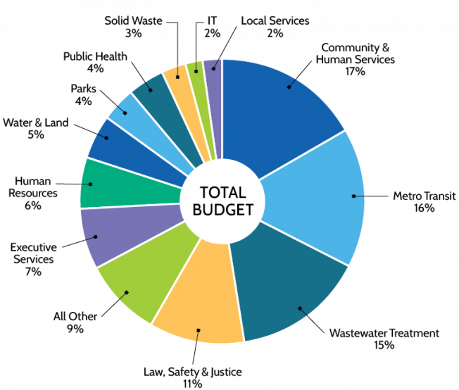 The King County budget is expected to total more than $19 billion over the next two years. It’s a wide-ranging budget – including services from transit to wastewater treatment (as shown in the pie chart above).