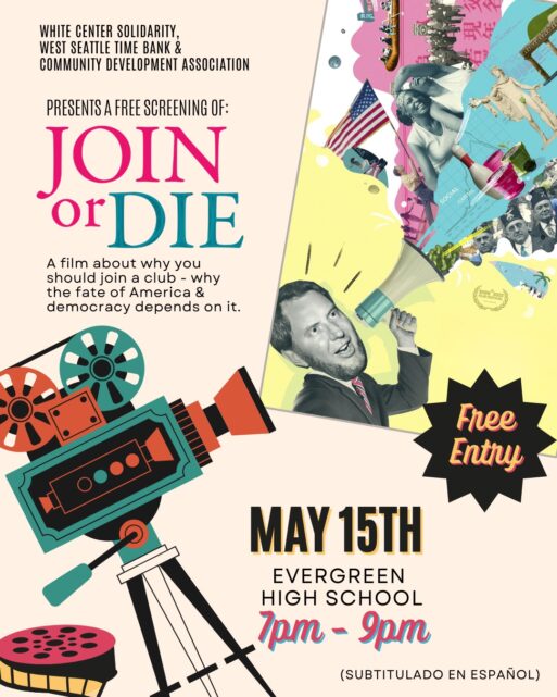 Kick off the weekend with a thought-provoking documentary hosted by West Seattle Timebank, White Center Solidarity & the White Center Community Development Association. “Join or Die” explores the importance of participation in clubs, organizations, and civic groups—and why community connection is key to both a longer life and a thriving democracy.